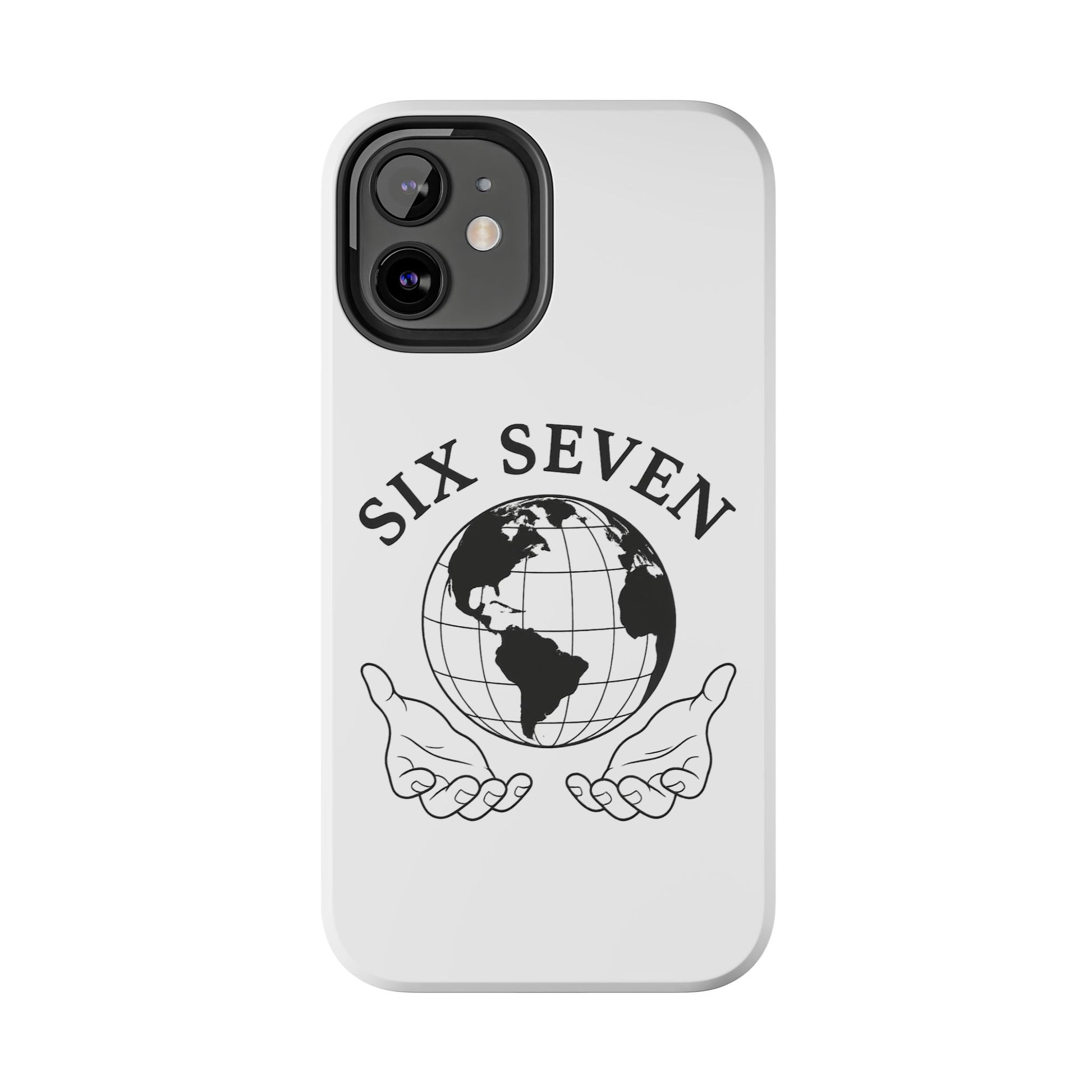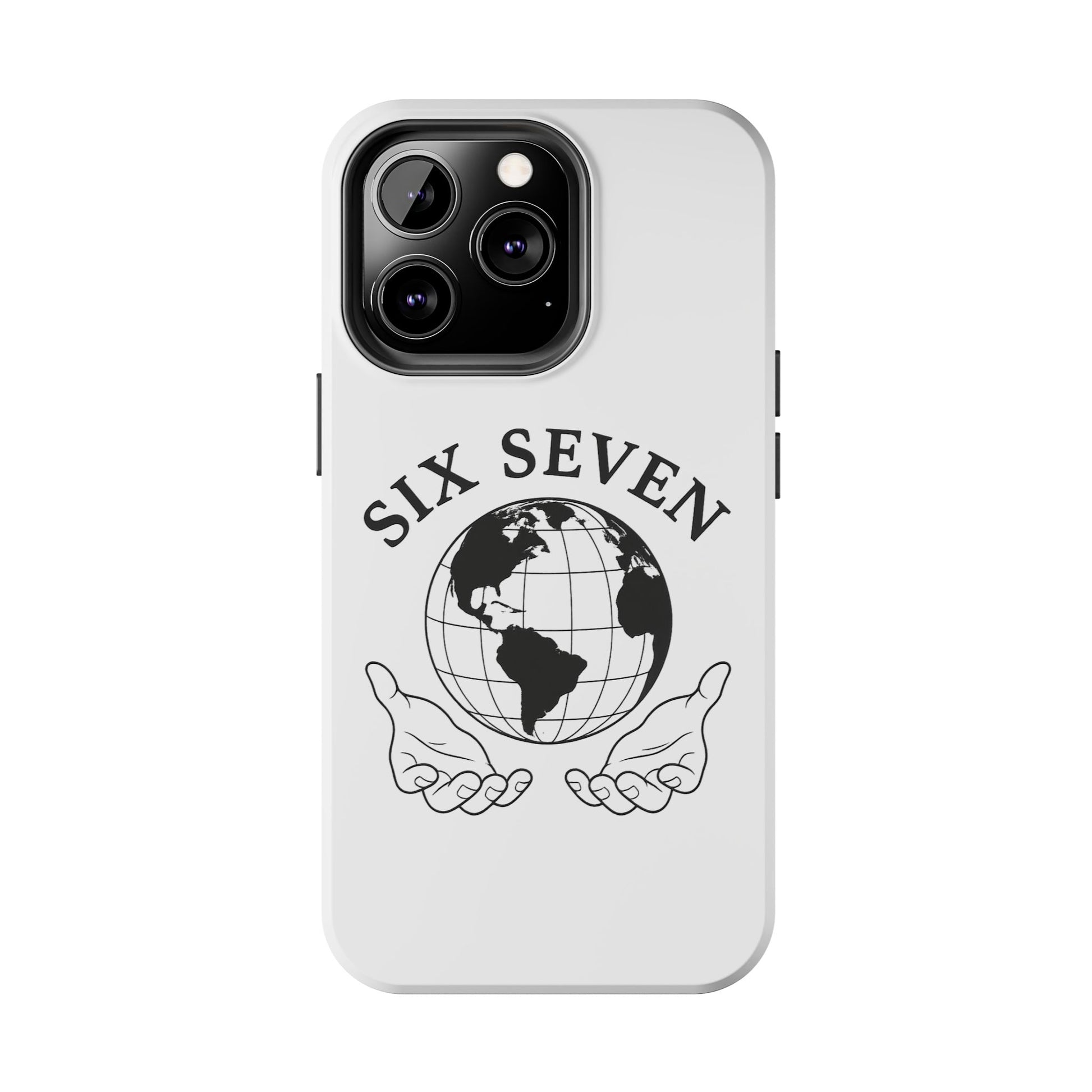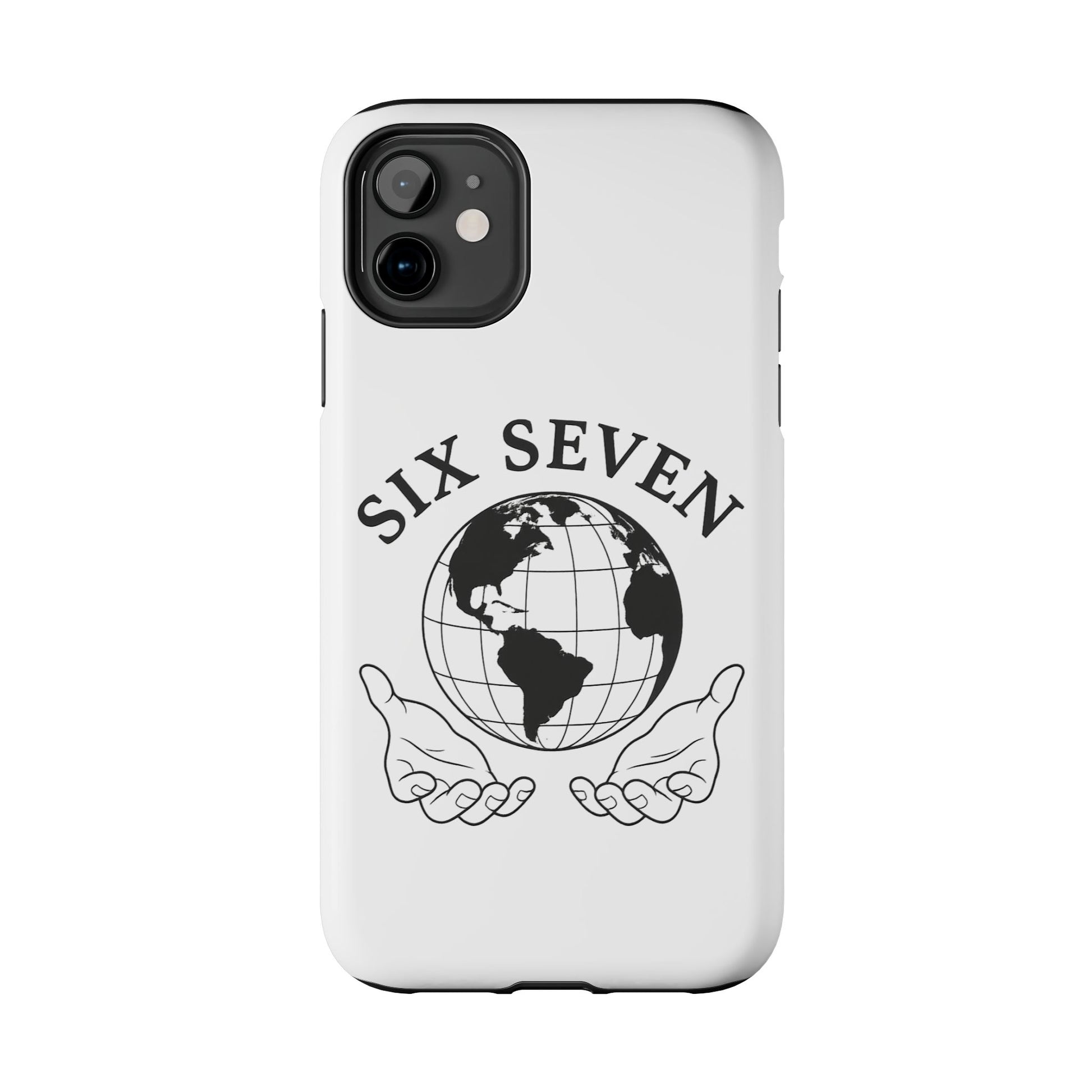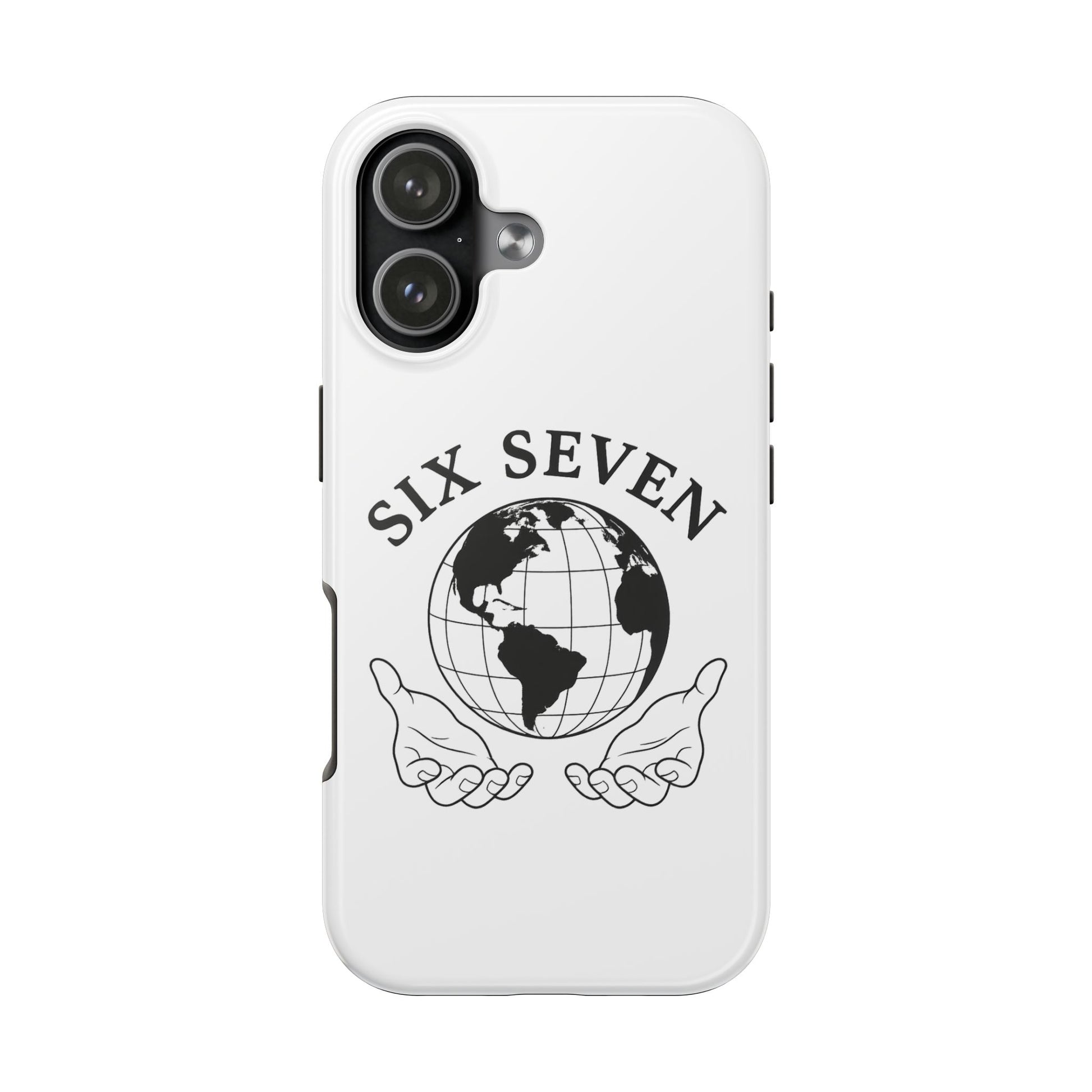 Carry a quiet reminder of connection wherever you go. This tough phone case wraps a classic monochrome globe and open-hands emblem in a glossy, durable shell — simple, meaningful, and built to last. The design reads like a small manifesto: Six Seven arches above the world, hands cupped beneath as if offering care and stewardship. It’s a calm, confident look that pairs cleanly with everyday outfits and travel-ready gear.