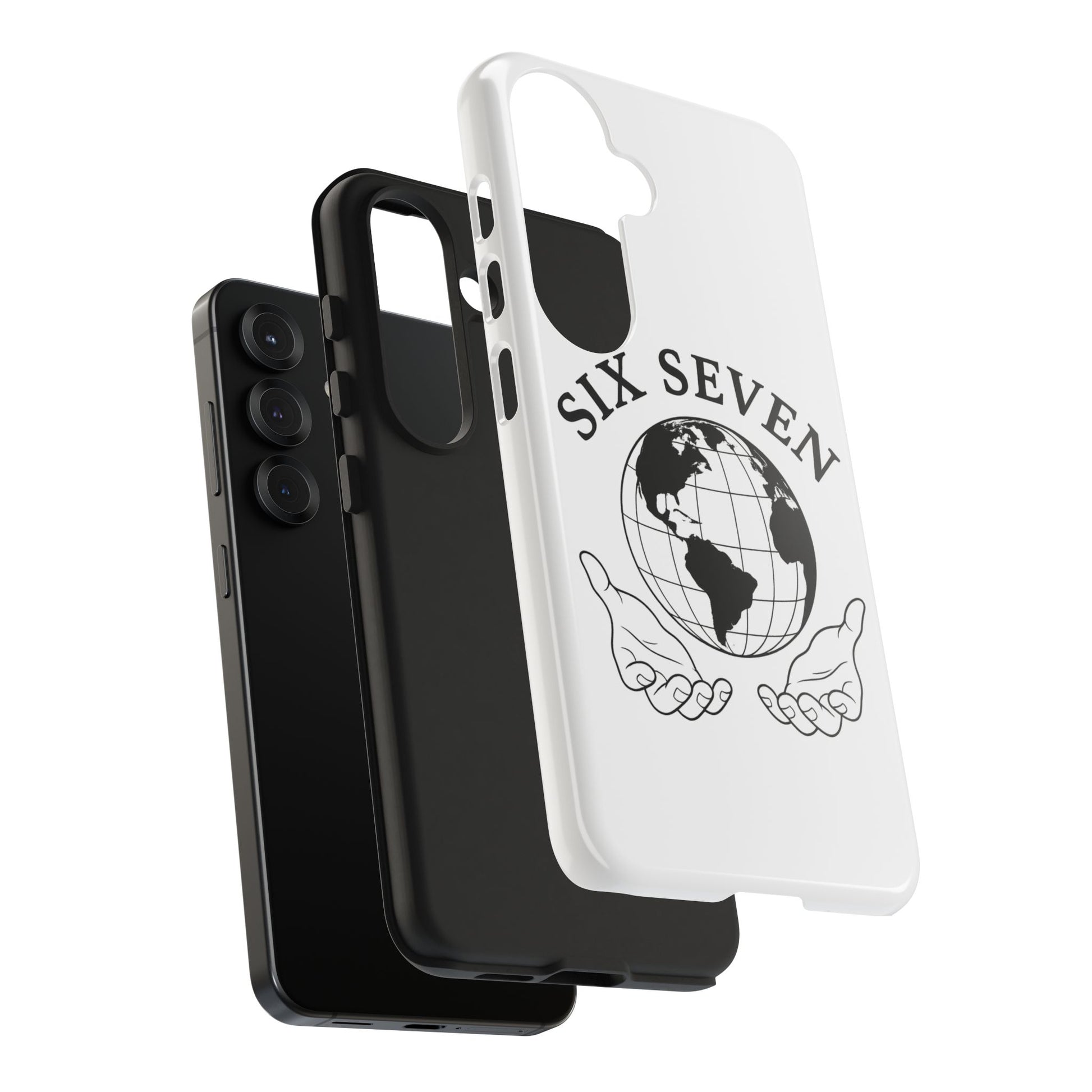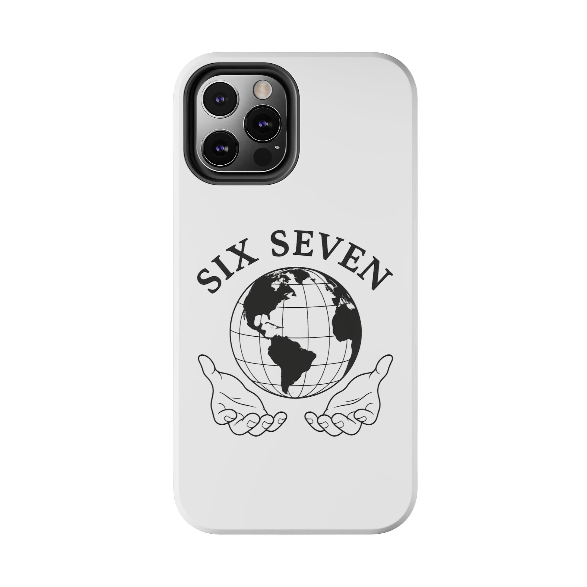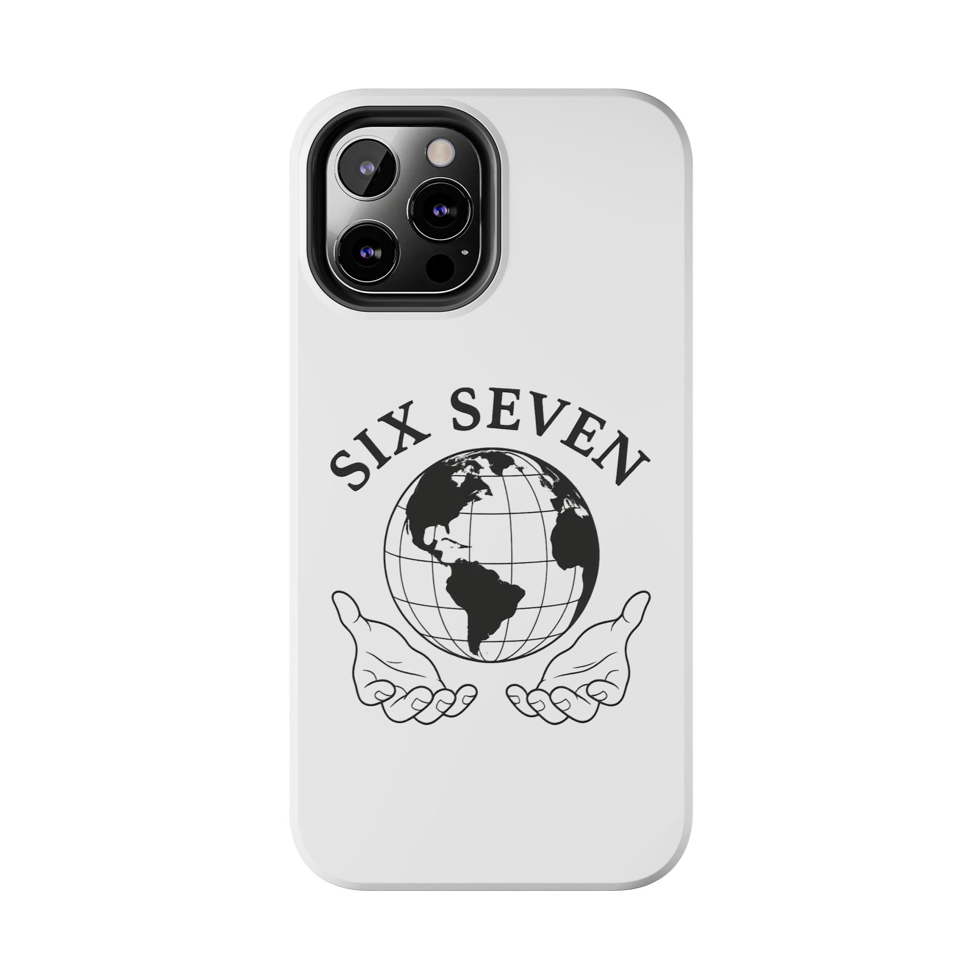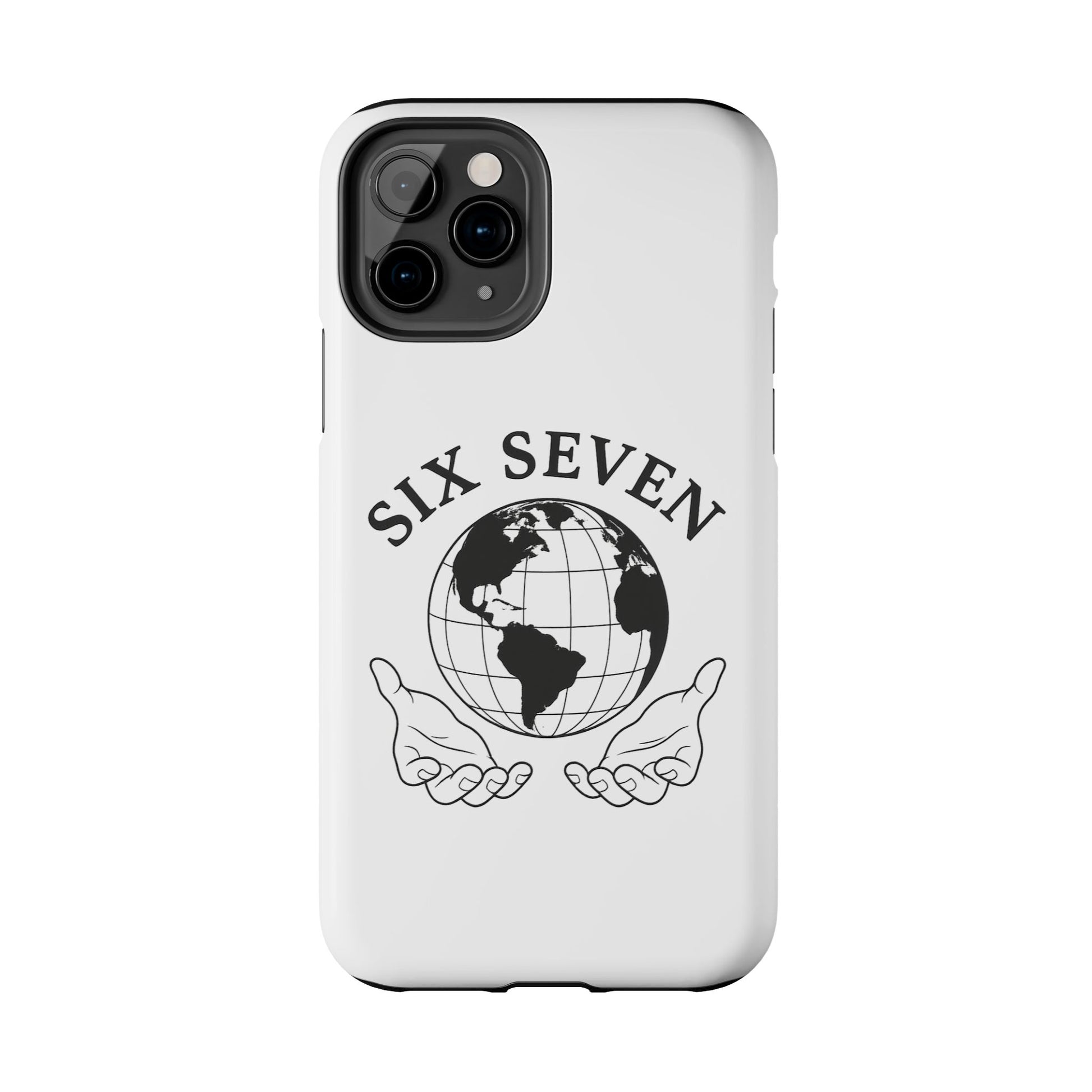 Carry a quiet reminder of connection wherever you go. This tough phone case wraps a classic monochrome globe and open-hands emblem in a glossy, durable shell — simple, meaningful, and built to last. The design reads like a small manifesto: Six Seven arches above the world, hands cupped beneath as if offering care and stewardship. It’s a calm, confident look that pairs cleanly with everyday outfits and travel-ready gear.