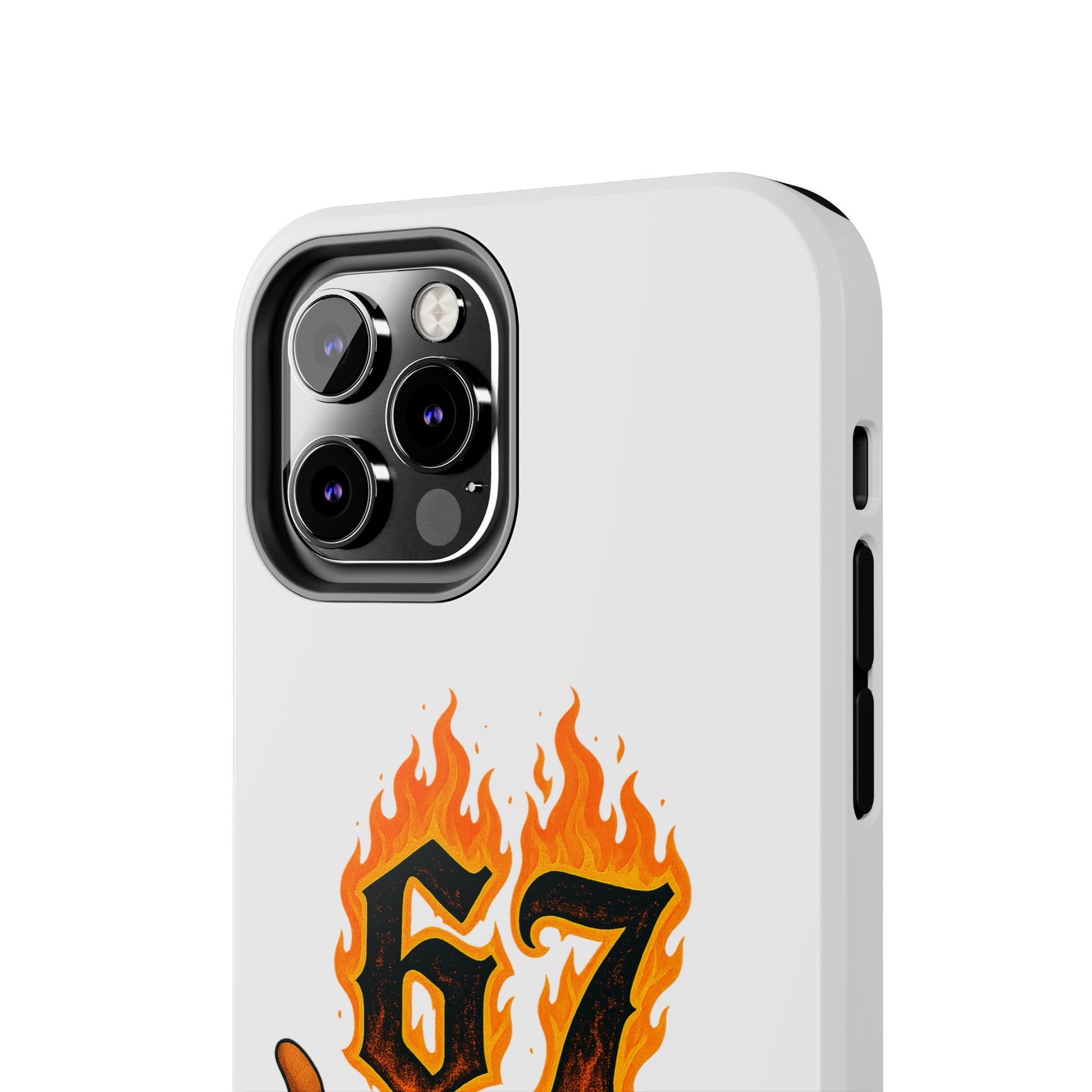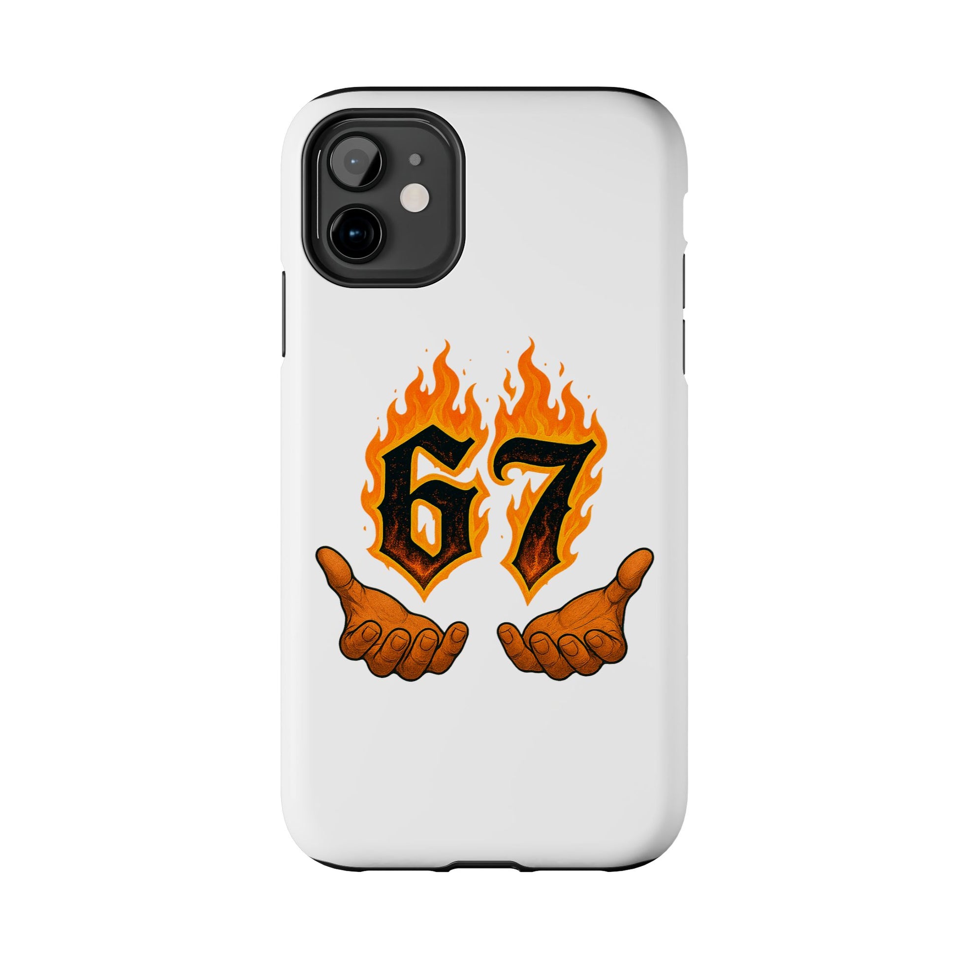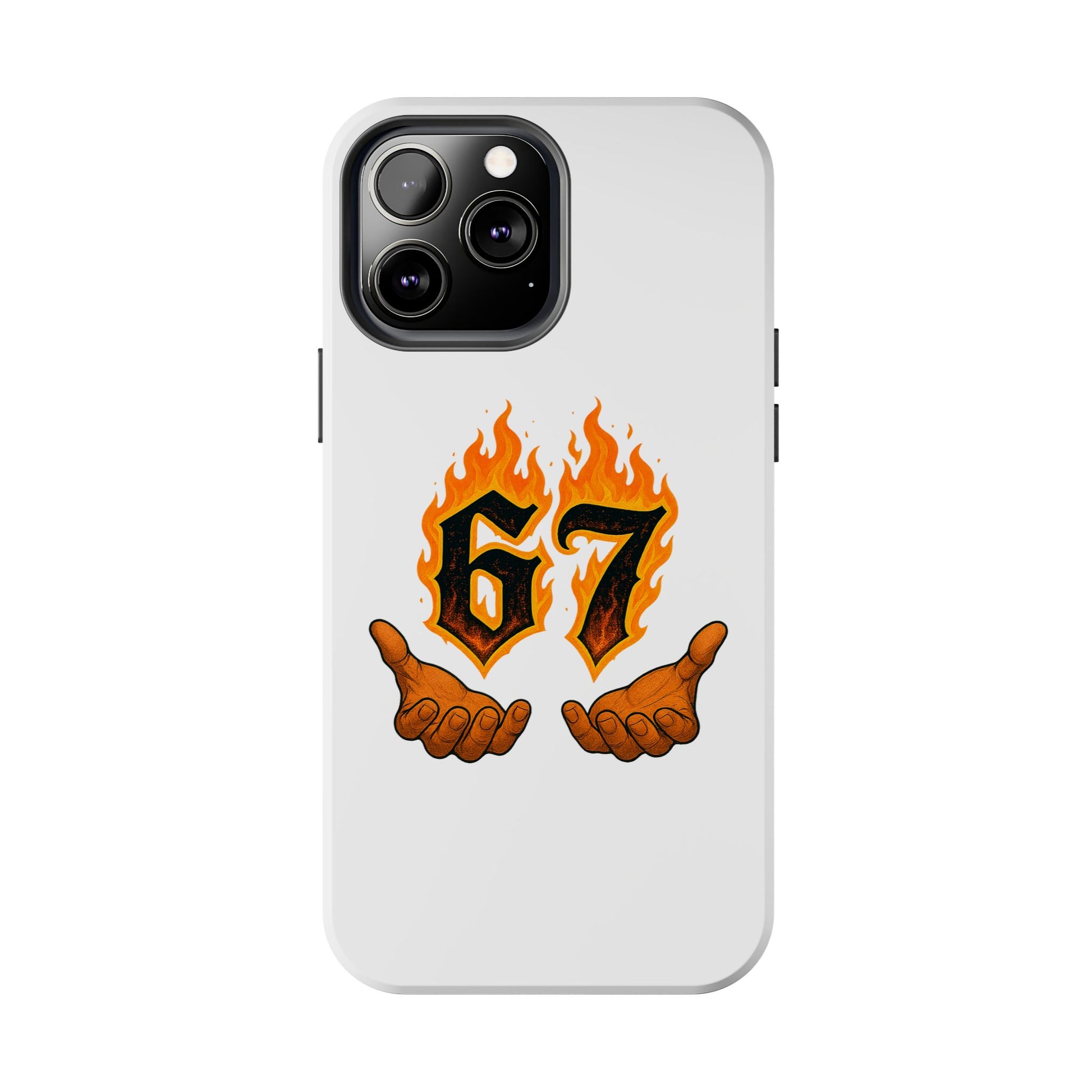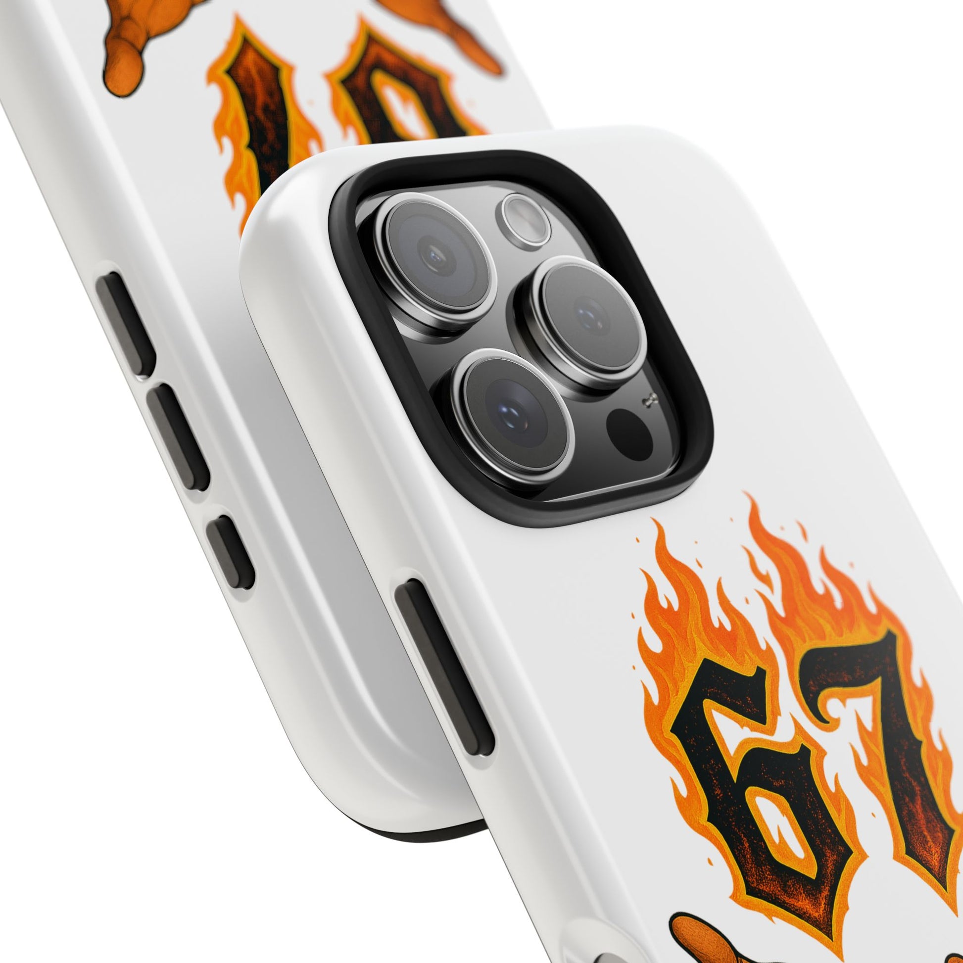 This tough phone case brings attitude and protection together. A bold flaming "67" sits above open hands, printed in vivid glossy color on a durable polycarbonate shell. The dual-layer construction — a rigid outer shell and a flexible TPU liner — soaks up shocks and disperses impact while a lay-flat bezel helps shield your screen from surface scratches. UV protection preserves the vibrant artwork through sun and daily wear. Slim enough for everyday carry, it still supports wireless charging and fits the latest iPhone 17 models as well as other popular phones. It’s for anyone who wants a bit of streetwise style with reliable drop resistance.